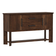 Sleek contemporary lines with intriguingly angled legs may catch your attention but the details of the Ronan collection will draw you in. Mango veneers applied over hardwood solids are polished off in a rich brown finish that flaunts the deep natural variations of the wood grain. Gently rounded edges pair with soft, textured fabric on the fully upholstered chairs and stools with tufting and exposed back frame details. In dining and gathering heights and a matching server, the Ronan collection proves that elevated and sophisticated can also be warmly inviting.