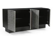 The Sevigny Server is a bold, modern inspired statement piece that commands attention. Crafted from solid mango wood in a sleek matte ebony finish, the case provides a refined and understated backdrop. The doors are the true highlight, made from cast aluminum with a striking contemporary textured design in an antique pewter finish, creating a bold contrast. Behind the four doors, adjustable shelves and media cord management ensure both style and functionality are seamlessly integrated. This server is designed to be the centerpiece of any modern space, combining striking design with practical storage.