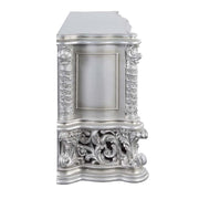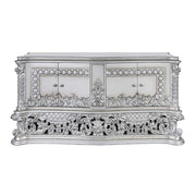 See the extravagant style and classical design all over the Valkyrie Dining Room Collection. Bold, intricate scrollwork accent is highlighted throughout each piece in this collection. Antique Platinum Finish paired with muted gray tone brings attention to its gorgeous details. Rectangular dining table showcases a timeless pedestal-style silhouette while matching chairs feature button-tufted upholstery for lavish comfort. Bring a dramatic change to your home with the Valkyrie Dining Room Collection.