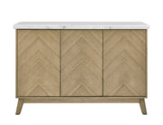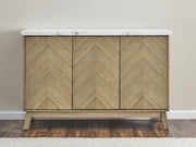 Clean modern lines and a knife edge marble top are the hallmarks of the Vida Marble Top Server. Soft touch doors are free of distracting hardware pieces creating a streamlined profile that allows the burnished blonde finished ash veneers to show through in a striking chevron pattern. But the beauty is not just skin-deep, behind the soft close doors are three adjustable shelves to accommodate bottles and storage of different heights allowing the perfect hidden storage for dining items. Whether in a dining, hallway or as an accent piece, the Vida Server offers clean modern style to accessorize any room.