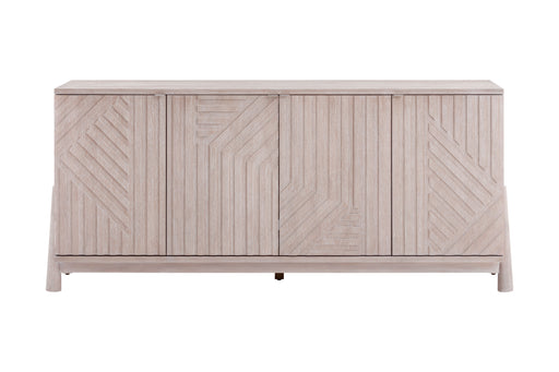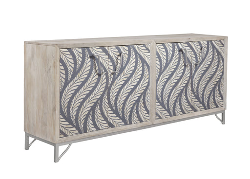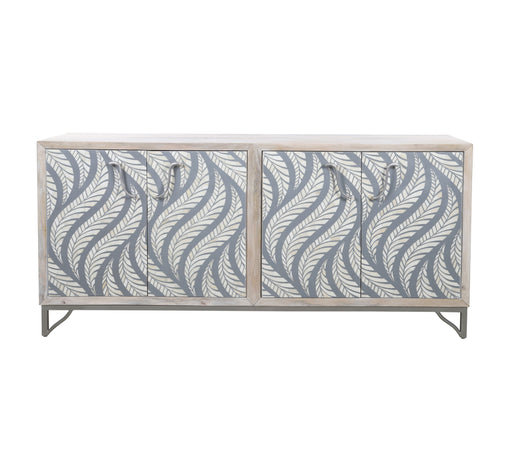 The Leia Server is a stunning modern piece, featuring a solid mango wood case frame finished in a light bleached tone. Its intricately patterned do...