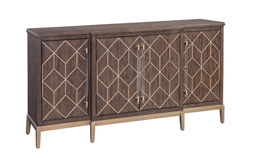 Perrine Brown Oak Server features modern glam design inspirations. The four doors feature a geometric carved design with a contrasting gold finish....