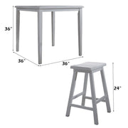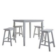 The Gaucho Counter Height Dining Set offers simplicity with a versatility perfect for any small dining space. This set boasts an space saving design, square leg table and four matching saddle style stools. The Table features a Solid Top and square legs.