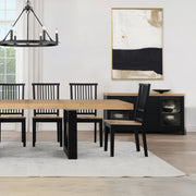 The Magnolia 80-96″ Dining Set exudes modern sophistication. The dining table boasts bold, clean lines and an expandable top, adorned with a striking stain and accents. Accommodating up to eight guests, it effortlessly extends from 80 to 96 inches with the included 16-inch leaf. Paired with the Magnolia Side Chair, this upholstered seat offers tailored elegance with side welting and a linen-look polyester cover for easy cleaning. Guests will relish the 4-inch cushioned seat atop the solid wood twin scissor leg base. Elevate your dining space with this blend of comfort and beauty.