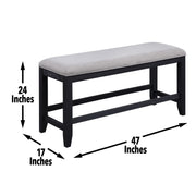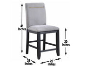 This dining set combines style and storage in one beautiful package. Crafted of acacia veneers and hardwood solids in a lustrous charcoal finish, the Counter Storage Base offers both display and storage with the clean modern lines you will appreciate. Brushed brass accents offer a great complement to the Charcoal finish and are featured on hardware and on the back of the performance fabric chairs. The Counter Height table, chairs and bench are a wonderful height for sitting and working and the seating can also be used on 36-inch height counters. Yves shows you do not have to sacrifice function for style in this Counter Height Dining ensemble!