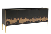 The Kali Iron Sideboard, where modern luxe meets timeless craftsmanship. Crafted from solid iron, each of its four doors undergoes a unique acid-wash process, resulting in a one-of-a-kind piece. Inside, discover functionality with four shelves and media cord management. Resting on slim tapered legs finished in brushed gold, Kali adds character and sophistication to any space.