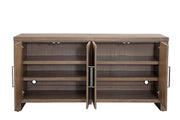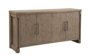 The McGuire Sideboard blends modern rustic farmhouse design with timeless craftsmanship. Crafted from solid mindi wood in a natural finish. Featuring four doors, two adjustable shelves, and media cord management, this cabinet seamlessly combines style with practicality. The light antique brass bar pull hardware adds character, enhancing the warm and inviting feel. With interlocking wood beams in end panels, the case design creates a unique and charming statement.