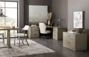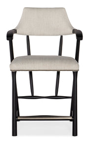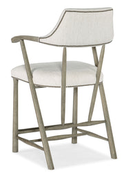 Organic, chic and comfy, the Stack Rock Counter Stool has a seat and back upholstered in the neutral texture Remington Porcelain fabric. The designer wood-framed silhouette and curved armrests. Nailhead trim adds crisp detail, and a metal-covered footrest adds more comfort