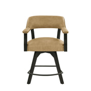 The Rylie 24-inch Counter Captain's Chair, blending mid-century modern charm with modern functionality, features a 360-degree swivel for versatile movement. Its sleek black frame contrasts with sand-colored vegan leather upholstery, highlighted by nailhead trim. The chair's mid-century modern canted legs ensure stability and add a dynamic visual element. An arched metal footrest provides comfortable foot support and enhances structural integrity. Ideal for a 36-inch high kitchen counter, this chair can also complement the Rylie counter dining and game set, adding style and comfort to your decor.