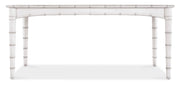 Capturing the vintage charm of the coastal South and the tropical craftsmanship of the West Indies, the Charleston Rectangle Dining Table has bamboo-motif accents and slender bamboo-style legs. The wood table has a Solid Wood Edge Top and is finished in White Heron, a softer interpretation of the classic Southern limestone white with a slightly brighter sheen, delivering an heirloom-quality finish. With one 20-inch leaf in place, the table extends to 88 inches long. The table accommodates 4 side chairs and two arm chairs without the leaf and 6 side chairs and two arm chairs with the leaf.