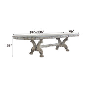Acme is proud to present a new addition to our exclusive Dresden dining collection! This exquisite dining table in vintage bone white will look lovely in your home, with ornate carvings and raised floral motifs on its apron and trestle base. Two self-storing butterfly leaves extend the table to comfortably seat ten or more guests. The trestle base ends in oversized claw feet for a sense of grandeur. The matching side and arm chairs feature arched backs and PU upholstery that wraps around the outside seatback as well as the apron for a luxurious feel. Each piece in this collection has a hand-brushed finish that is meticulously applied to create an antiqued look. Complete your formal dining area with matching buffet and curio cabinet with touch light for the gorgeously appointed home of your dreams.
