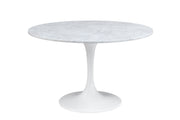 The Dunham Dining Table embodies modern sophistication, featuring a white marble top that boasts elegant gray veining and natural variations. The piece stands on a white matte tulip base, which enhances its clean, fluid lines. Measuring 48 inches, this table comfortably seats four, offering a sophisticated setting for any dining occasion. It's a perfect blend of form and function, designed to complement a range of interior styles with its timeless appeal and graceful presence.