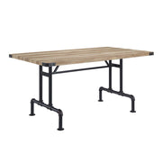 Featuring a rectangular wooden tabletop in an oak finish the Edina dining table merges farmhouse and industrial elements for the ideal dining table for the modern home. Metal corner protectors with rivets that elevate the tabletop. The metal pipe trestle base provides strength and durability and completes the industrial look.