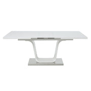 This Kamaile dining table is modern and stylish, and the smooth white high gloss is inviting in any dining space. The extending dining table features a beautiful chrome base with an open U-shaped pedestal and is complimented by a wooden top. The tabletop can be easily expanded to accommodate additional dining guests.