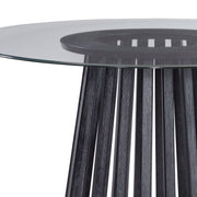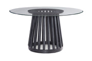 The Mateo Round Dining Table features a round tapered slat base design for a contemporary style. Features a 54" round clear glass table top. The wood table base is finished in a cerused black oak veneer. Additional features include adjustable floor levelers. Comfortably seats 4 people.