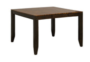 • The Melissa gathering height table bridges the space between casual and formal dining with a lively two-tone finish on solid acacia wood.
