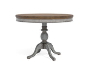 Capture the relaxed look of an inviting cottage with the Plymouth round dining table. Taller than your standard dining table, this piece lends a more casual feel to spaces where you gather to share meals or interact. Featuring a distinctive carved pedestal base, this timeless design easily fits in smaller dining areas or game rooms and comfortably seats four. A weathered finish is enhanced by the medium brown table top, evoking a vintage charm that adds warmth and character.