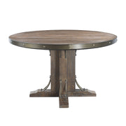 Enhance the industrial, rustic, or farmhouse style of your home with this Rapaela round dining table The single pedestal base provides maximum stability while allowing sufficient leg space for comfortable seating. The metal trim gives this table a modern touch. Constructed from durable materials, this table guarantees long-lasting, dependable performance and enduring beauty.