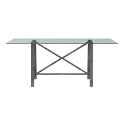 The Ross Rectangular Dining Table features a metal X cross base design. Finished in a hand-brushed pewter and powder coated steel. Rectangular glass table top seats a party of six. Features adjustable floor levelers.