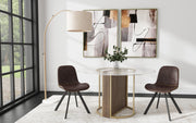 The Stefan Dining Table features a Mid-Century Modern inspired design combining a champagne metal frame and mindi veneers in a chalk gray stain. Accommodates up to a 54" glass top. Finish: champagne, chalk gray stain. Material: metal, rubberwood solids and mindi veneers. Uses up to a 54 inch glass top and can comfortably seat 4.
