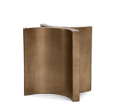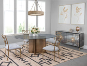 The Symmetry Dining Table features a modern sculptured base in antiqued silver leaf finish with gold wash to give the appearance of patinated Bronze. Tapered cylindrical arcs are conjoined to form the base, with beveled lay-on scratch resistant top glass. Bold, Modern, understated.