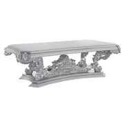 See the extravagant style and classical design all over the Valkyrie Dining Room Collection. Bold, intricate scrollwork accent is highlighted throughout each piece in this collection. Antique Platinum Finish paired with muted gray tone brings attention to its gorgeous details. Rectangular dining table showcases a timeless pedestal-style silhouette while matching chairs feature button-tufted upholstery for lavish comfort. Bring a dramatic change to your home with the Valkyrie Dining Room Collection.