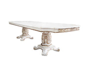 Commanding attention in any space, the impressive design of the Vendom double pedestal dining table will impress everyone. Adorned with classic elements including scrolls, curved shapes, and leaf molding accents to create an old-world charm. The antique pearl finish is accentuated with hand-brushed gold to make the molding details stand out.