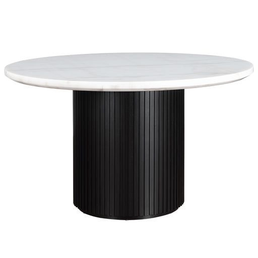 Step into sophistication with the timeless elegance of the 52″ round Colvin dining table. Inspired by art deco and Empire styling, this modern marv...