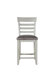An upholstered Counter Chair that sports a stone gray finish and vegan rawhide seat to make a stylish and comfortable addition to any kitchen or dining area. The horizontal slatback design features a shaped top rail for a relaxed transitional appeal. Stretchers add structural support and a place to rest your feet when seated at the Hyland Counter Table or a Counter Bar.