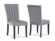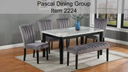 Elevate your dining space with this luxurious and modern dining group, designed to bring elegance and sophistication to every meal. The stunning faux-marble tabletop offers a sleek and polished look, beautifully complemented by the bold, black frame for a striking contrast. The plush, velvet-upholstered chairs and bench feature chic vertical channel tufting, providing both comfort and contemporary flair. Perfect for hosting dinner parties or enjoying everyday meals, this set seamlessly blends style and functionality. With its refined aesthetic and durable craftsmanship, it’s the perfect addition to any modern home looking for a touch of glamour.
