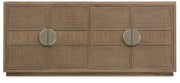 Blending organic textures and neutral tones with a refined minimalist silhouette, the stylistically versatile Sonnet Dining Credenza exudes a natural luxury. The four cane-front doors are soft close with magnetic catches, and the left pair of doors has one drawer with a removable cream-colored felt silverware tray. The right pair of doors has one drawer with a drop-in felt liner. There’s one adjustable/reversible wood shelf with wine storage option that holds up to 9 bottles in each pair of doors. The marble inset top combines cream, beige and brown colorations. The frame is crafted of Quartered and Cathedral-Cut White Oak Veneers in a light earthen-toned finish. Satin-finished large semi-circle pulls add a swanky accent.