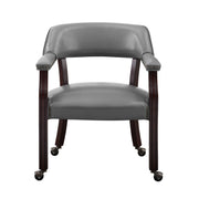 Enjoy both game night and dining night with this dual purpose dining and game table. The 48-inch round table comes in a medium finish and can accommodate four comfortably for dining with a game top that converts into a game table worthy of Las Vegas The upholstered.captain's chair is castered for easy mobility and comes in a wide range of colors perfect for every decor.