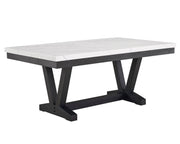 A fresh take on a traditional silhouette makes this group a great addition to your dining space. A faux marble top provides an elegant look while being easy to care for. The trestle base is updated in a contemporary charcoal finish. The upholstered dining chairs feature gently sloped wings and a nail head trim on the back. Button tufting accents the dining bench.