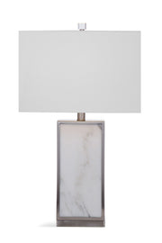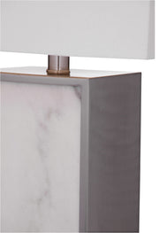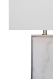 The Adair Table lamp has a clean rectangular base and an elegant marble finish. This lamp is a simple yet beautiful addition to any living area. The white marble body is surrounded by a complimentary silver brushed metal frame. The lamp is completed with a modern white linen lamp shade and crystal finial.