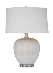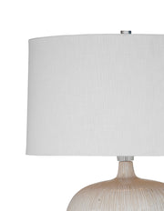 • The Arcadia Lamp features a round, white ceramic body with vertical tan grooves flowing from the neck