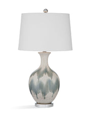 The Briony Table Lamp features a round, off-white ceramic base featuring blue and gray brushed painting. The paint style features some variation and has a distressed look. To complete the lamp is a white, tapered drum lamp shade.