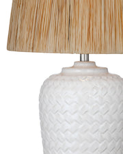 The Cendra Table Lamp combines rustic charm and texture, featuring a ceramic body with a raised, interwoven design that gives the appearance of woven fabric. This tactile pattern is painted in a versatile, neutral tone that complements a variety of color palettes. The lamp is topped with a unique raffia lamp shade, whose natural fibers add a layer of organic warmth, casting a patterned light that adds ambiance to any space. Its a perfect fit for interiors that appreciate natural materials and a handcrafted aesthetic.