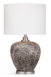 The Charlotte Table Lamp is crafted of ceramic with a raised black and ivory finish, silver accents and a drum shade.
