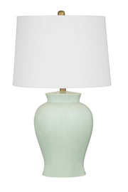 The Cimarron Table Lamp features a classic urn silhouette in a soft light green finish, bringing a traditional elegance to any space. Paired with a crisp white tapered drum shade, this timeless design adds a refined and calming presence to your home.