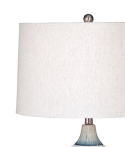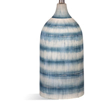 The Hayes Table Lamp is crafted of ceramic in stained blue and cream strips with an oatmeal textured linen tapered shade.