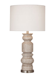 The Helford Table Lamp combines modern and traditional design with its intricately carved wood base, adding texture and elegance to any room. The clean lines and detailed craftsmanship of the base are beautifully complemented by a simple drum-style shade, which softens the light and creates a warm, inviting ambiance. This versatile lamp fits seamlessly into various interior styles, offering both style and functionality. The Helford Table Lamp is an ideal choice for adding a refined touch to your space while providing practical lighting.