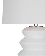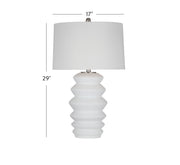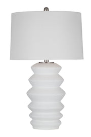 The Hess Table Lamp is crafted of resin with a white tapered shade. Finish: matte white. Material: resin. Wattage: 100W Max. Bulb Type: A. Socket Type: E26. Switch Type: 3 way. The hand crafted details produced by a skilled artist lends itself to a unique technique and will vary slightly. COO: China.