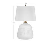 Embark on a journey of style with the Journey Table Lamp. Its matte cream ceramic base, adorned with etched detailing, exudes contemporary organic charm. The tapered drum-shaped lamp shade, crafted from black cotton slub, adds a touch of elegance to your space. Customize your lighting experience with the 3-way turn knob switch, and with a generous 98-inch cord, you have the flexibility to place it wherever it complements your decor. Illuminate your home with the subtle beauty of the Journey Table Lamp, a perfect blend of modern style and timeless sophistication.