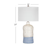 The Lucy Table Lamp is crafted of resin with a white drum shade. Features a coastal style with the organic shape and light blue and white color palate. Required type A bulb that is not included. Features a 3 way turn knob light switch and up to 100 watts.