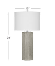 - Gray cement lamp body provides a raw, industrial aesthetic