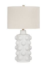 The Lynn Table Lamp features a white ceramic base with intricate knob detailing, offering a sculptural element with subtle texture. A neutral linen shade complements the design, casting a soft, ambient glow. Its clean finish and thoughtful detailing bring an understated elegance to a variety of interiors, blending effortlessly with both classic and contemporary styles.