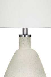 The tear shaped Niello Table Lamp features brushed silver accents with a tapered white linen drum shade. The lamp is finished in a white finish with blue-green, putty, and black colored paint flecks. The overall effect is very soft and cohesive.