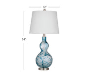 The Reeve Table Lamp is crafted of art glass with a white tapered shade. Finished in a mottled blue glass.