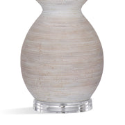 • The white washed, beige ceramic lamp base and horizontal texturing provides boho styling