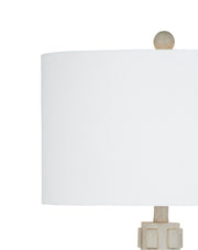 The Satule Table Lamp is crafted of bulb shaped resin base finished in a natural gray cement. The 3D geometric carvings are highlighted with gold brush rubbing. The table lamp also includes a white linen drum shade. The hand crafted details are produced by a skilled artist, lending itself to a unique technique and which may feature slight variations between each piece.